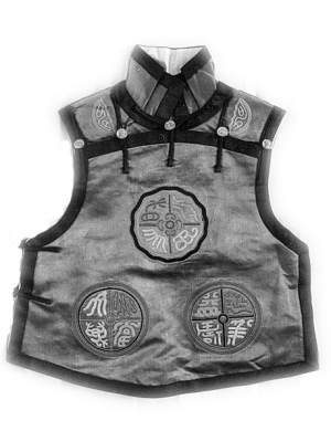 坎肩,又稱(chēng)背心、馬甲。巴圖魯坎肩是京師八旗旗人最時(shí)尚的一種款式,其樣式是在“一字形”的前襟上裝有排扣,兩邊腋下也有紐扣?!鞍蛨D魯” 一詞源自少數(shù)民族語(yǔ),是我國(guó)北方某些民族專(zhuān)門(mén)賜給強(qiáng)悍勇士們的美稱(chēng)。 巴圖魯坎肩源于蒙古族杜爾伯特部男子穿兩邊有衩的大襟短坎肩。早先有27道扣袢兒,胸前9道扣袢兒,兩側(cè)各9道扣袢兒,后來(lái)變成胸前9道,兩側(cè)各7道扣袢兒,以白色綢緞為面料,以青色綢緞為沿邊兒。巴圖魯坎肩從前是兵卒之服,早先在面料和里子之間安放魚(yú)鱗式薄鐵片,作為保護(hù)身體的甲片。