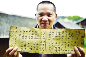 圖為仁吉侗寨村民吳昌賢在展示祖輩流傳下來(lái)的古老蘆笙曲譜。  吳國(guó)楨 攝影報(bào)道