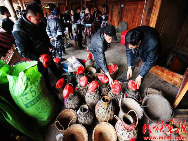 這次結(jié)婚的共有15對(duì)新人(多時(shí)有二三十對(duì)),均來自本寨的青年男女?;槎Y從大年二十六開始,共進(jìn)行三天,在三天的婚禮中新郎新娘家均有婚宴,尤以第一天中午的規(guī)模最大也最為隆重。