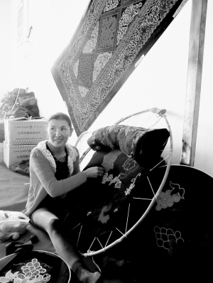 巴合提古麗展示她正制作的民族刺繡坐墊套