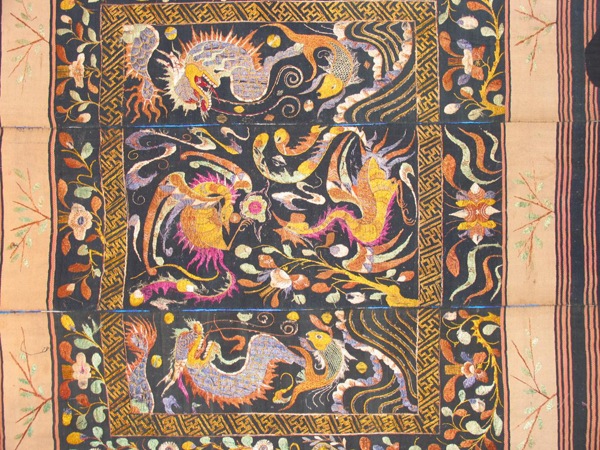 從龍被的圖案中,我們可以辨別出它是屬于哪個(gè)年代的作品。早期的圖案多為人形紋和鬼紋(人的靈魂),這兩種圖案實(shí)際上都是一樣的,是由色彩的明暗來區(qū)分的,明的是人形紋,暗的是鬼紋。后來的龍被,因受漢族文化的影響,圖案也逐漸漢化了。因此,后期的龍被,織物和部分圖案保留黎族文化,而刺繡的花紋圖案都是漢文化的。