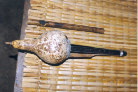 阿昌族的樂器主要有竹琴、洞簫、葫蘆簫(右圖,劉軍攝)、三月簫、銅口弦、三弦、象腳鼓(下圖,蒙哥提供)、铓鑼等。葫蘆簫是用葫蘆連接三根竹管制成的,它有7個音,音量小,音調(diào)低緩圓潤,一般晚上用。三月簫用一根竹管制成,也有7個音,它的音量大,音色細(xì)亮,多在白天使用。葫蘆簫和三月簫不僅是阿昌族人民心愛的傳統(tǒng)樂器,還是男女青年傳情示愛的媒介。