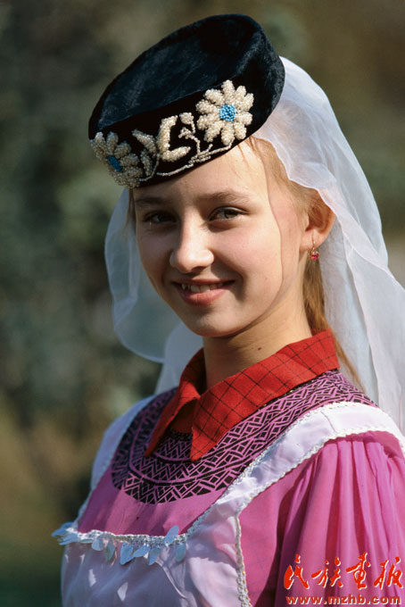 塔塔爾族的婚俗別具一格。按塔塔爾人的傳統(tǒng)習(xí)慣,婚禮在新娘家舉行,即先把新郎“嫁”出去,然后再“娶”回來(lái)。婚姻過(guò)程主要經(jīng)歷提親、相親、訂婚、納聘、嫁新郎、娶新娘六個(gè)過(guò)程(塔塔爾族少女。引自民族畫報(bào))。