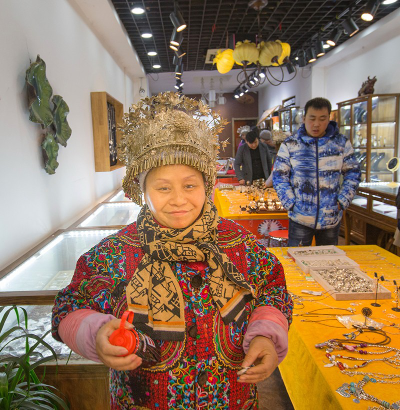 楊玉芬初到西安,是2008年來(lái)參加西部洽談會(huì)。那一次,她的苗族銀飾一天里賣(mài)了幾萬(wàn)元,讓她十分驚喜。洽談會(huì)一結(jié)束,她一出來(lái)就直接打的,上去就問(wèn)司機(jī)你們西安哪里最熱鬧?。克緳C(jī)說(shuō)當(dāng)然是回民街啦!她便讓司機(jī)帶著直奔回民街,下了車(chē),就地找了個(gè)攤位就擺起貨來(lái)。沒(méi)想到兩個(gè)小時(shí)就賣(mài)了3000多元。在西安生意這么好做啊!楊玉芬當(dāng)即決定不走了,鐵下心留在回民街。當(dāng)初,在滿(mǎn)是小吃的回民街上突然出現(xiàn)這么一個(gè)穿著苗服的女子忙來(lái)忙去賣(mài)銀飾,的確顯得很扎眼。但楊玉芬不把自己當(dāng)外人,很快融入了回民街,生意如同芝麻開(kāi)花節(jié)節(jié)高,賣(mài)的品種越來(lái)越多,掙的錢(qián)也越來(lái)越多。她的攤位從小到大,從街邊升到室內(nèi)。去年,楊玉芬干脆在離回民街入口很近的黃金地段租了一間幾十平米的大店鋪,徹底結(jié)束“練攤”的日子,名正言順開(kāi)起了“苗奶奶”銀飾店。有著上千種精美銀飾的“苗奶奶”,今天已成為坊上的一道風(fēng)景。