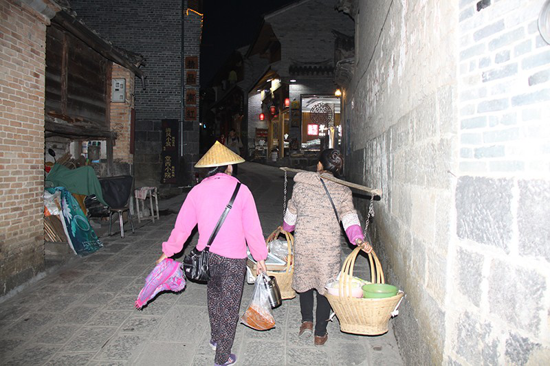 晚上7點(diǎn)多鐘,一群在小河里撲騰了一天的鴨子排著隊(duì)憨態(tài)可掬地回到寸家灣巷口,忙碌一天的人們也開始回家。我正擔(dān)心晚上約定的采訪找不到地方,卻在圖書館旁邊的小巷里碰到了收工回家的姜聰留。她今天的松花糕賣了一板半,收入100多元。同行的一個姐妹幫她挑著擔(dān)子,姜聰留自己提著袋子和板凳,一路無語。臨近家門的路口,姜聰留從姐妹肩上接過擔(dān)子,眼神默契相視后,各自回家——這就是她們的生活。晚飯姜聰留到丈夫的大哥家吃土鍋?zhàn)?,兩家的院子只隔一墻,我也跟著進(jìn)了大哥江宗良的家門。