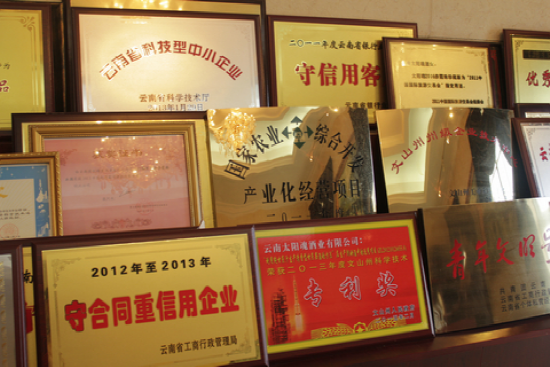 十幾年的風(fēng)雨兼程,太陽魂酒業(yè)有限公司榮膺多項(xiàng)殊榮,先后獲得“云南省農(nóng)業(yè)產(chǎn)業(yè)化省級(jí)龍頭企業(yè)”、“云南省農(nóng)產(chǎn)品加工重點(diǎn)企業(yè)”、“全國(guó)休閑農(nóng)業(yè)與鄉(xiāng)村旅游示范點(diǎn)”、“云南省著名商標(biāo)”、“云南省省級(jí)企業(yè)技術(shù)中心”、“2009中國(guó)(昆明)酒業(yè)發(fā)展高峰論壇暨新中國(guó)60周年云南酒業(yè)十大功勛品牌”及“云南酒類消費(fèi)市場(chǎng)十大最具成長(zhǎng)性品牌”、“云南省接待用酒”等榮譽(yù)稱號(hào)。已獲得QS認(rèn)證、ISO9001認(rèn)證,HACCP認(rèn)證等高標(biāo)準(zhǔn)企業(yè)資格證書。產(chǎn)品質(zhì)量達(dá)到國(guó)內(nèi)先進(jìn)水平,釀制的“赤霞珠”葡萄酒獲2006年亞洲葡萄酒質(zhì)量大賽金獎(jiǎng)、北京國(guó)際葡萄酒暨烈酒挑戰(zhàn)賽銅獎(jiǎng)和第八屆中國(guó)國(guó)際葡萄酒及烈酒評(píng)酒會(huì)上榮獲銀獎(jiǎng),梅里圣地冰酒榮獲2006年亞洲葡萄酒大賽銀獎(jiǎng)、2012年亞洲質(zhì)量大賽金獎(jiǎng)及領(lǐng)袖產(chǎn)區(qū)代表產(chǎn)品。朗姆酒2011年榮獲“2011中國(guó)(蓬萊)國(guó)際葡萄酒?烈酒品評(píng)賽”銀獎(jiǎng)。2011年國(guó)際釀酒師葡萄酒烈酒大賽中獲得銀獎(jiǎng),2012年獲得國(guó)際釀酒師葡萄酒烈酒大賽金獎(jiǎng)。2012年,公司釀造的赤霞珠產(chǎn)品被法國(guó)勃艮第大學(xué)葡萄酒學(xué)院指定為教學(xué)用酒。2013年7月,“梅里圣地赤霞珠冰酒”榮獲2013中國(guó)優(yōu)質(zhì)葡萄酒挑戰(zhàn)賽金獎(jiǎng)。同時(shí),公司位于德欽產(chǎn)區(qū)的干紅及冰酒已通過有機(jī)產(chǎn)品認(rèn)證。2014年“2012梅里冰酒”榮獲國(guó)際領(lǐng)袖產(chǎn)葡萄酒(中國(guó))質(zhì)量大賽優(yōu)質(zhì)獎(jiǎng),拍品價(jià)格1萬元。