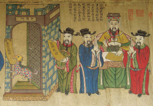 與畬族有關的圖畫主要包括清朝乾隆年間皇家繪制的《皇清職貢圖》,畫內有相關的畬族資料和家族祖圖。今藏的祖圖多為清代物品,以麻布、土布為底,平圖勾勒,濃墨重彩,以條狀橫幅長卷居多,也有直幅多屏組合而成的。畫面配有文字說明,圖文并茂,展示了畬族的歷史發(fā)展、社會生產(chǎn)、文化習俗等。畬民家族祖圖分布范圍較廣,主要在福建、浙江、廣東等省。