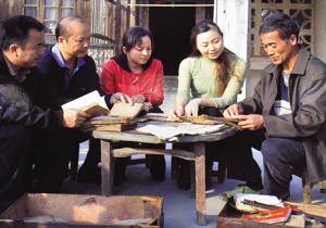 布依儺書(shū)先生(右)向考察人員講解布依族文字