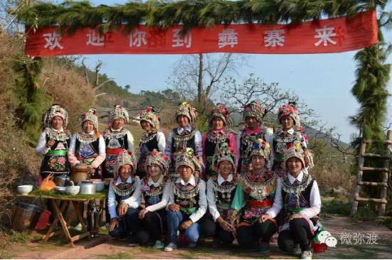 “羅羅潑支”男女服飾的特點(diǎn):“羅羅潑”男子服飾與“迷撒潑”相差無幾,一般不戴白頭巾。但是婦女的服飾相差卻很大,明顯保留著古樸高雅的南詔遺風(fēng)。頭飾由桂花、包頭、飄帶、大墜子、蜜蜂墜、芝麻鈴組成。桂花墊子在裱布上蒙黑色面料,中間訂有銀飾。包頭以黑色為主,長約2米,后鏈系于包頭,鏈子為銀制。飄帶長約4尺,黑色留花邊,兩頭訂英蘇。包頭還系有大墜子、蜜蜂墜各一對,芝麻鈴20個。領(lǐng)合由裱布黑色面料上訂芝麻玲20個圍在脖子上。圍腰的前胸部,由領(lǐng)口至腹部,左右各垂掛一條綴有串珠、針筒、響篾(口弦)一類飾品和生活用品的銀質(zhì)項(xiàng)鏈。人一走動,全身的小蘇鈴就響,聲音悅耳動聽,形象美觀大方。額頭前還圍有一塊翠綠色的“桂花綁”,綁上釘有銀質(zhì)小泡泡200多顆,羅羅潑支婦女的服飾彰顯華麗之美。
