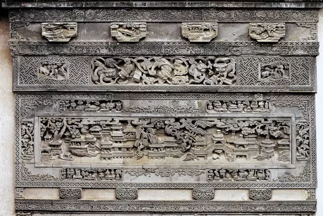 磚雕指在青磚上雕出山水、花卉、人物等圖案,是古建筑雕刻中很重要的一種藝術(shù)形式。