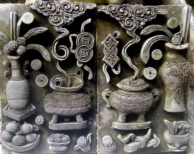 在藝術(shù)上,磚雕遠(yuǎn)近均可觀賞,具有完整的效果。在題材上,磚雕以龍鳳呈祥、和合二仙、劉海戲金蟾、三陽(yáng)開泰、郭子儀作壽、麒麟送子、獅子滾繡球、松柏、蘭花、竹、山茶、菊花、荷花、鯉魚等寓意吉祥和人們所喜聞樂(lè)見(jiàn)的內(nèi)容為主。在雕刻技法上,主要有陰刻(刻劃輪廓,如同繪畫中的勾勒)、壓地隱起的淺浮雕、深浮雕、圓雕、鏤雕、減地平雕(陰線刻劃形象輪廓,并在形象輪廓以外的空地鑿低鏟平)等。民間磚雕從實(shí)用和觀賞的角度出發(fā),形象簡(jiǎn)練,風(fēng)格渾厚,不盲目追求精巧和纖細(xì),以保持建筑構(gòu)件的堅(jiān)固,能經(jīng)受日曬和雨淋。