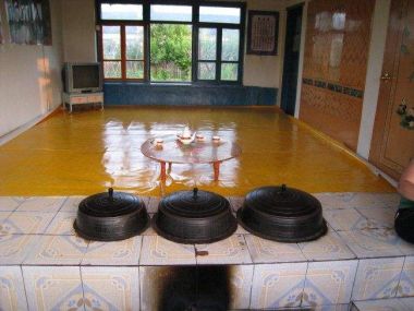 朝鮮族傳統(tǒng)民居建筑主要采用燒炕的采暖方式。一般有多大的屋子,就有多大的炕,這點(diǎn)與東北地區(qū)的漢族與滿族類似。一般在早上燒兩灶就可以維持一天,冬天非常溫暖,朝鮮族人們可以在炕上進(jìn)行任何活動。