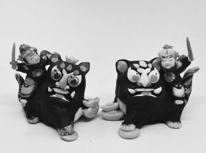 泥叫虎是山東高密的一種民間泥塑,起源于明代萬(wàn)歷初年,是形、色、聲、動(dòng)俱佳的民間工藝品,與撲灰年畫(huà)、剪紙并稱(chēng)為“高密三絕”。泥叫虎腰部由牛皮連接,擠壓其頭部和尾部后,會(huì)發(fā)出響聲,叫虎一名由此而來(lái)。河南也有叫虎,又稱(chēng)皮老虎。相較之下,山東的泥叫虎更具特色,而且在藝術(shù)風(fēng)格上更大氣,樣式憨態(tài)可掬,哨子發(fā)出的聲音也十分有趣。