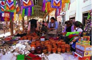 西藏的地勢西北高而東南低,西北寒冷而東南溫和,西北以牧業(yè)為主,東南以農(nóng)業(yè)為本,西北以皮袍御寒,東南多以氆氌裝遮體。皮袍和氆氌裝質(zhì)地不同,但都結(jié)構(gòu)肥大,袖口寬敞,穿著自如,白天陽光充足,氣溫高時,可脫袖露臂,調(diào)節(jié)體溫,夜間可解帶和衣而眠。皮袍和氆氌裝一般均用腰帶,男子穿時提起下擺與膝平齊,腰帶一束,懷里形成空囊,里面可裝不少隨身用品。只要出門,懷中一般必有一件不可缺少的東西,就是木碗。一般的木碗價廉物美,平民百姓承受的起,更重要的原因還有與不共碗習俗有關。