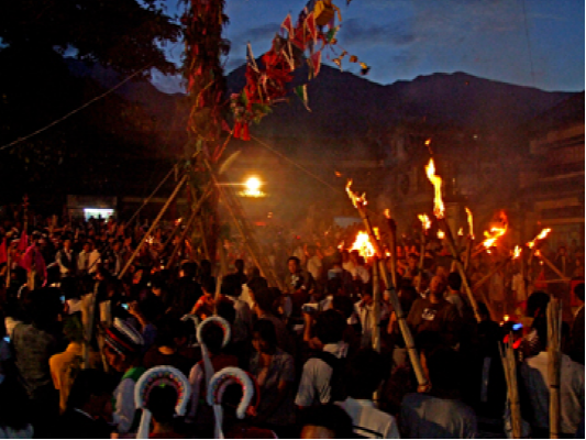 白族視火為生命與靈魂的護(hù)佑物,古有火崇拜習(xí)俗,火把節(jié)是白族對(duì)“生之禮贊和死之緬懷的節(jié)日”?;鸢压?jié)這一天,各村由年內(nèi)新添子嗣之家作“會(huì)首”,在場(chǎng)壩中豎一高大的火把,常年扎十二臺(tái),潤(rùn)年扎十三臺(tái),頂端扎升斗旗幟,上書“風(fēng)調(diào)雨順”、“五谷豐登”字樣,下懸花紅、梨子、銅錢等物。天擦黑點(diǎn)燃火把,會(huì)首們以糖果、炒蠶豆、煙、茶、酒招待相聚在場(chǎng)壩中的老小。兒童則一手持小火炬,一手往火炬上撥灑松脂粉沐相戲,對(duì)新生的嬰兒表示致賀禮贊。與此同日,新亡故者之家人須上墳祭祀,在新故者墳前或大門口豎一小火把,如是者三年,表示對(duì)死者的緬懷,與史書“星回日祭祖”的記載相合。