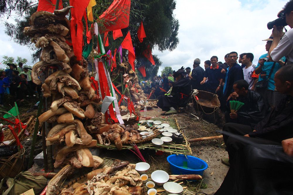 人們傳說只有醉倒了"霞神",它才能永遠(yuǎn)留在這方,才能使這里風(fēng)調(diào)雨順。當(dāng)水書先生念了最后的咒詞,祭典才在鼓樂聲和歡呼聲中結(jié)束。最后,各族系將祭肉一并聚攏,聚餐慶祝。天黑之后,人們秘密地將"霞神"收藏起來,至此,"敬霞"活動全部結(jié)束。