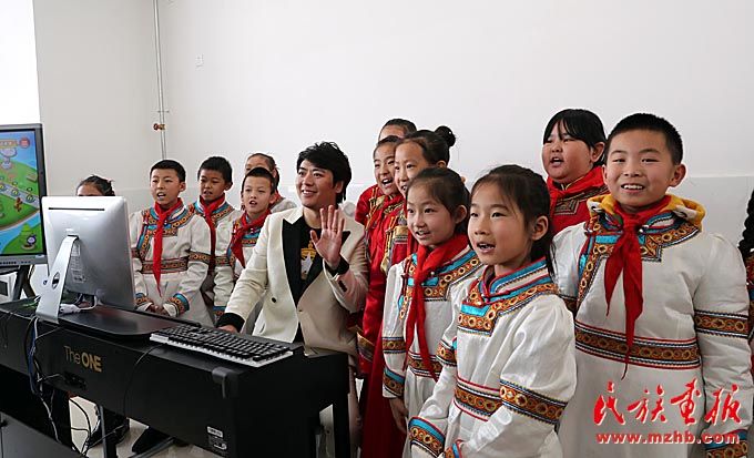 在“快樂(lè)的琴鍵”音樂(lè)教室捐贈(zèng)儀式上,朗朗與內(nèi)蒙古藝術(shù)劇院直屬烏蘭牧騎演員聯(lián)合表演了《鴻雁》。