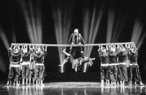 在靜謐的夜空下,首先映入觀眾眼簾的是群舞演員在舞臺中央,用身體構(gòu)建的人字形“情人房”。房內(nèi)的瑤族姑娘正在小憩,或許是被屋外的動靜驚醒,她推門出外察看,重重的門軸聲劃破了夜的寂靜,原來是愛慕者正攀在一根竹竿上向自己示愛?!盁o竹不成瑤”,舞蹈伊始,最核心的道具——一根長約8米、杯口粗的竹竿就出現(xiàn)了。借助竹竿,群舞演員通過造型組合及隊(duì)形變換,不斷再現(xiàn)生活場景:山坡上、小橋上、屋檐下、窗欞邊……情隨景遷、情景交融,生活圖景和人物情緒巧妙地融合在一起,營造出一種別樣的意境,極大地引發(fā)了觀眾的聯(lián)想。