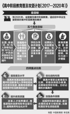 據中國民族報訊 2017年4月6日,教育部公布《高中階段教育普及攻堅計劃(2017-2020年)》(以下簡稱《攻堅計劃》)?!豆杂媱潯诽岢觯?020年,全國普及高中階段教育。我國高中階段教育毛入學率將要達到90%。