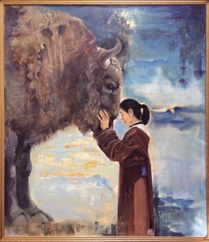 雍忠卓瑪?shù)膫€(gè)人畫展受到業(yè)內(nèi)外的諸多好評(píng),也有觀眾專程從外地去拉薩觀展。展覽結(jié)束當(dāng)天,雍忠卓瑪特意和畫作《我和它》合影,并將合影發(fā)布在社交平臺(tái)上?!斑@是我與牦牛博物館結(jié)緣的作品?!彼蛴浾呓榻B。畫面上,穿著藏袍的少女閉著眼睛,用左手撫摸牦牛的面頰,額頭輕觸牦牛鼻尖,表情寧靜祥和。