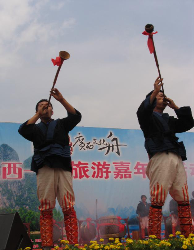 民間娛樂和日常祭祀用的樂器,有長鼓(黃泥鼓)、銅鼓、嗩吶、洞簫、笛子、銅鈴、簡板、長號、牛角、銅鑼和皮鼓等。長鼓、牛角、竹笛等樂器,在宋代的樂器中,已廣泛采用,是十分動聽的一種樂奏。牛角,是瑤族特有的古老樂器,演奏時用以伴奏,其聲“鳴鳴”然,遠(yuǎn)近無不聽聞。長號、銅鑼、鈸、二胡等樂器是外族傳入瑤區(qū)的,他們除了吸取外族演奏的技藝之外,根據(jù)自己的民族特點,增添了不少的本民族生活色彩,演奏技巧更為高超,深受群眾歡迎。