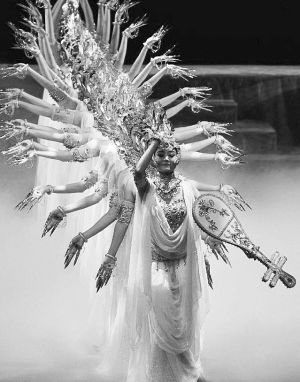 在敦煌舞的動作素材積累方面,無論是對敦煌壁畫舞姿的歸類、整理,對“敦煌舞特有的S型曲線運動規(guī)律”的發(fā)現(xiàn),以及“運用中國古典舞蹈的節(jié)奏韻律,把靜止的姿態(tài)與其風(fēng)格統(tǒng)一的動作過程結(jié)合起來,形成比較完整的舞蹈運動和造型體系”,還是在創(chuàng)作層面上《絲路花雨》對“反彈琵琶”典型壁畫舞姿的發(fā)展,《千手觀音》對“千手”舞姿造型的無限變化發(fā)展,以及《飛天》超越人體動作范圍極限對“三道彎”典型敦煌舞姿風(fēng)格的強化等,都是敦煌舞在動作素材層面的積極建設(shè)和發(fā)展。