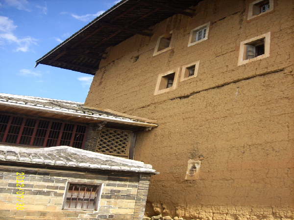 土樓和長(zhǎng)城差不多,是用糯米、石灰、蛋清和泥土混合而成的外墻,內(nèi)部是用黃木和杉木,夏可抵暑氣,冬可抵冽風(fēng),還可自動(dòng)調(diào)節(jié)室內(nèi)的溫度。