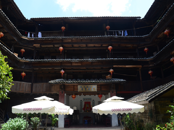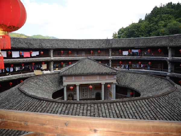 一座土樓就是一個(gè)藝術(shù)殿堂。每一座土樓,又如同一個(gè)“大家族,小社會(huì)”。土樓內(nèi),居住在同一屋頂下的幾十戶幾百人同祖同宗同血緣同家族,過(guò)著共門戶、共廳堂、共樓梯、共庭院、共水井的和睦生活。這種聚族同樓而居的生活模式,典型地反映了客家人的傳統(tǒng)家族倫理和家族的親和力。而且,樓內(nèi)的客家人,住著層數(shù)相同、開間面積相等、無(wú)明顯朝向差別、更無(wú)貴賤等級(jí)之分的均等居室。平等聚居,反映了客家人融洽和睦的家風(fēng)和平等團(tuán)結(jié)的傳統(tǒng)。