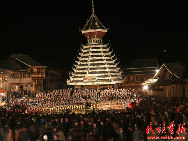 后來,鼓樓功能逐漸擴(kuò)大,不僅有擊鼓報信,召集族人議事的場所功能,還成為村寨的娛樂休閑中心。鼓樓在侗語叫“百”,意為“扎堆”、“聚集”。農(nóng)閑時節(jié)或耕作之余,人們來到鼓樓下聊天、唱歌、講故事。每逢喜慶節(jié)日,盛裝的侗家人就會在鼓樓坪歡聚一堂,吹蘆笙、踩歌堂,演侗戲,年輕人甚至利用這個場所對歌敘情、談情說愛。正如侗族民歌中所唱“鼓樓是村寨的暖和窩,沒有鼓樓無處尋歡樂,高高的杉木豎起鼓樓來,有了聚集的地方有了歡樂的歌”,這些正是對鼓樓功能擴(kuò)大的最好佐證。