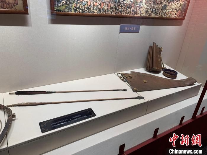 本次展覽將皇帝東巡期間所做的四項主要活動內(nèi)容向觀眾做以介紹,它們是“習武展雄風”“暢飲一家親”“祭陵敬先祖”“百禮在皇宮”。其中,“習武展雄風”這部分展出了“清皇帝行圍鈚箭”“清嘉慶帝行圍櫜鞬”“清弘歷御用樺皮弓”“清射鹿鈚箭”等文物。據(jù)介紹,清帝東巡出山海關(guān)到東北地區(qū),所經(jīng)路途山林茂密,大型猛獸居多,正是實地演練的最佳時機。