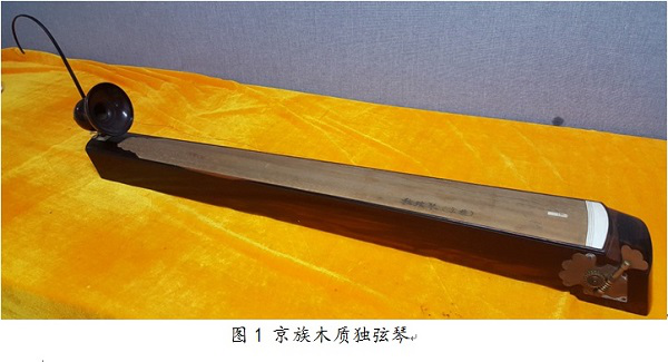 京族獨弦琴的制作工藝傳統(tǒng),其材質(zhì)有竹、木質(zhì)兩種。竹制獨弦琴的琴體通常取大斑竹為原料,制作時選粗細勻稱、質(zhì)地密實的一段竹子,截長為120厘米左右長度,再劈成1/3和2/3兩部分,取2/3部分的竹筒進行打磨、打孔,再安裝竹制搖桿、麻繩或竹篾削制的琴弦,竹質(zhì)獨弦琴即制成;木質(zhì)獨弦琴的琴體多選生長于當(dāng)?shù)氐耐┠緸樵牧?,取長約100-120厘米的木料,切割成數(shù)塊木板,打磨后將木板拼成長方形木匣為琴身,一端插上一根與琴身呈直角的、用牛角制成的弧形柱子,圓柱上安裝一瓢型(葫蘆形)共鳴器,再將一根金屬絲從瓢中心引向琴的另一端,固定在的弦鈕上,木質(zhì)獨弦琴即制成。