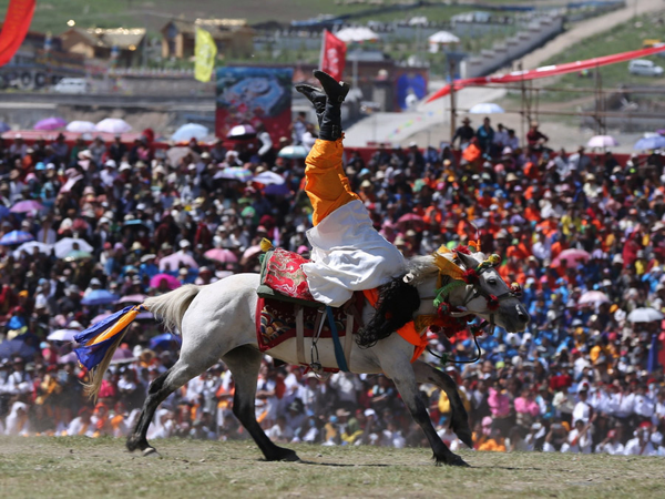 馬上運(yùn)動(dòng)驚險(xiǎn)刺激,是藏族人民非常喜歡的運(yùn)動(dòng),每當(dāng)舉行賽馬活動(dòng),親朋好友都要前去助陣,得勝者都有獎(jiǎng)勵(lì),親戚朋友還要為得勝的主人和馬披紅掛彩。
