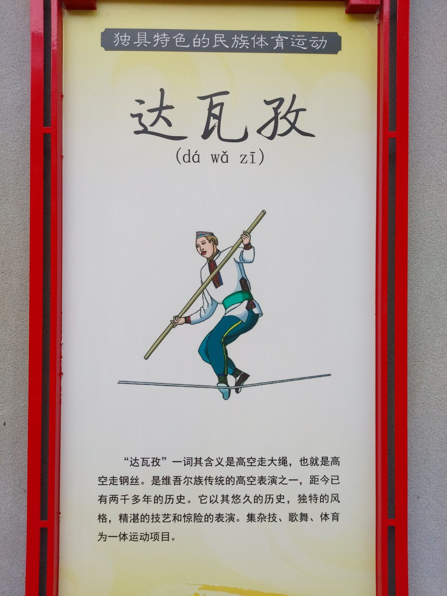 “達(dá)瓦孜”一詞其含義是高空走大繩,也就是高空走鋼絲。是維吾爾族傳統(tǒng)的高空表演之一,距今已有兩千多年的歷史。它以其悠久的歷史,獨(dú)特的風(fēng)格,精湛的技藝和驚險(xiǎn)的表演。集雜技、歌舞、體育為一體運(yùn)動(dòng)項(xiàng)目。