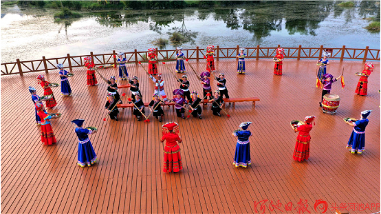 都安各族群眾在澄江國(guó)家濕地公園表演打扁擔(dān)。