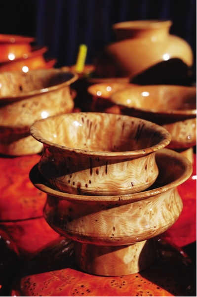 官員們使用的木碗,固然也非常注重外面的金銀寶石包裹,而木碗本身,也有一套非常固定的學(xué)問(wèn),盛開(kāi)水不裂,摔到地上不會(huì)破,不燙手不冰手,體輕而質(zhì)固,經(jīng)久耐用,可以爺孫相傳。用這種碗盛食,可以完全保持食物原味,吃酥油糌粑等油肉類(lèi)食品猶為適宜。比之于一般瓷碗,是碗中上品。這種木碗一般都是選用一些稀有雜木的節(jié)或者根雕琢而成,除了材料本身,在加工過(guò)程中的工序也十分重要,必須要加工出來(lái)一些獨(dú)特的花紋,比如磷火紋,或豬鬃紋,或貓頭鷹眼紋等,有這種花紋的碗,就要格外名貴,比如這次普布次仁兄弟所制作的大型核桃木碗,全身均勻地布滿了貓頭鷹眼紋,所以才能賣(mài)出這么高的價(jià)格。在西藏很多地區(qū),都流傳著這樣一個(gè)諺語(yǔ):“一只上等木碗等于10頭牦牛。”