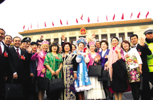 十三屆全國(guó)人大一次會(huì)議開幕前,少數(shù)民族代表身著盛裝,在人民大會(huì)堂前留影。 本報(bào)記者 張國(guó)欣攝