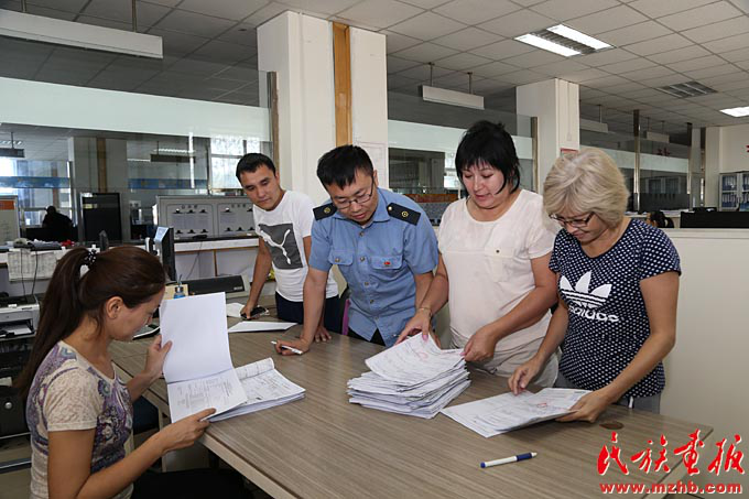 中哈兩國鐵路人員在阿拉山口口岸進行貨物交接驗收(滕俊 攝影)