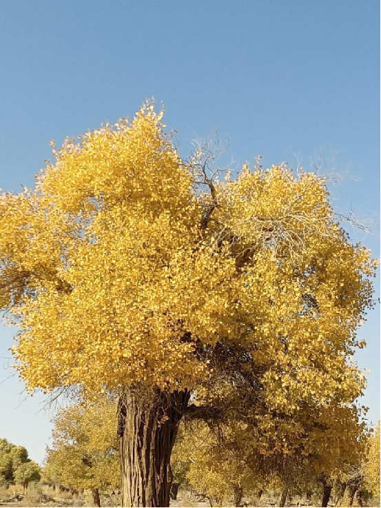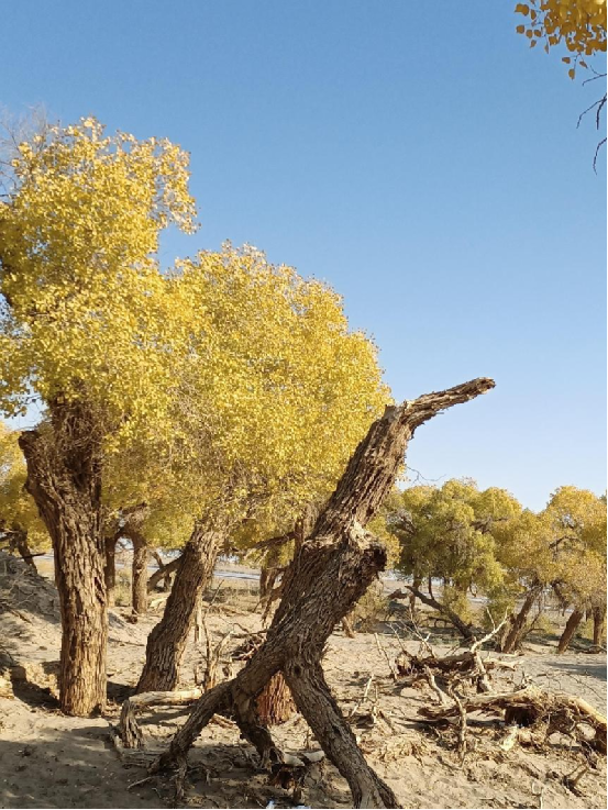 每當深秋季節(jié),胡楊樹葉變得一片金黃,形成胡楊秋色,樹影婆娑,奇妙絕倫,賞心悅目。漫步在濃郁的胡楊林中仿佛進入神話般的仙境。茂密的胡楊千奇百怪,神態(tài)萬般。粗壯的幾人難以合抱,挺拔的七、八丈之高,怪異的似蒼龍騰越,似虬蟠狂舞,令人驚奇不已,嘆為觀止。僅就密密匝匝的樹葉,也是風(fēng)采獨有。幼小的胡楊,葉片狹長而細小,宛若少女嫵媚的柳眉,人們常常把它誤認為柳樹;壯齡的胡楊,葉片又變成卵形、闊卵形或三角形,猶如興安嶺的白樺;進入老年期的胡楊,葉片才定型為橢圓形。更令人稱奇者,在同一棵胡楊樹冠的上下層次,還長著不同形狀的葉片,因此,又稱“異葉楊”