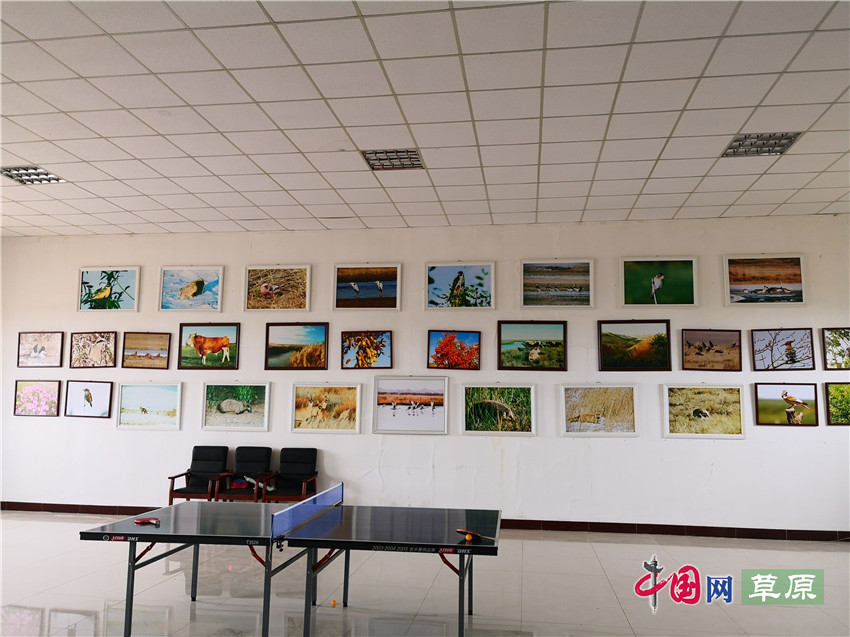 薩如拉圖雅嘎查農(nóng)牧民培訓(xùn)基地展廳,墻上掛滿了廷·巴特爾牧場野生動植物攝影作品