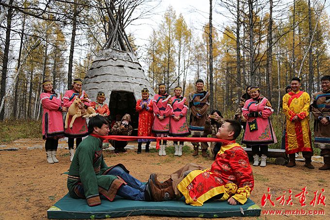 鄂倫春族傳統(tǒng)民俗文化帶動(dòng)了鄉(xiāng)村旅游發(fā)展。圖為鄂倫春族傳統(tǒng)婚俗表演。