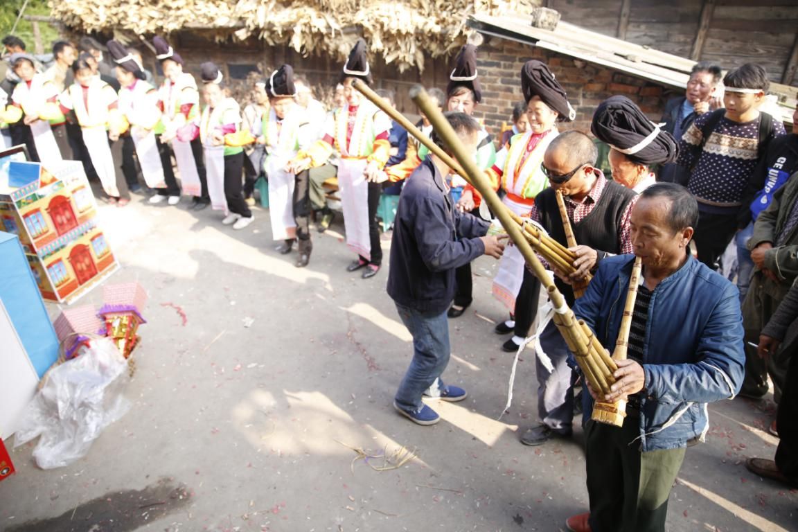 蘆笙詞曲:高坡的蘆笙詞主要以口述詞代代傳承,蘆笙詞(曲)分為“懷念曲(僅一曲)”、“喜曲”、“吊喪曲(僅一曲)”,據(jù)王永貴老師介紹原來三百六十天每天有一曲,到現(xiàn)在僅傳承七十二曲或最多一百二十曲。在吹奏和舞步方面內(nèi)容相同,但技巧方面各個(gè)村寨略有差異。在曲的排列上“懷念曲”為第一曲,吹奏第一曲時(shí)必須站著吹,每開始吹,必須先吹第一曲,否則會(huì)被人取笑不懂規(guī)矩。從這點(diǎn)看來,“懷念曲”有很強(qiáng)的民族認(rèn)同感和地域特殊性。高坡蘆笙以苗語腔調(diào)為主旋律,不懂苗語腔調(diào)的人無法自然跟隨蘆笙的曲調(diào)起舞?!暗鯁是北仨氃趩适禄顒?dòng)才能吹,它的舞姿比較特別,以跪拜亡者的姿態(tài)為主。