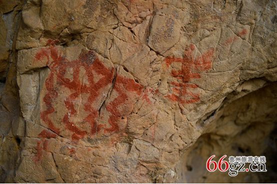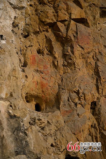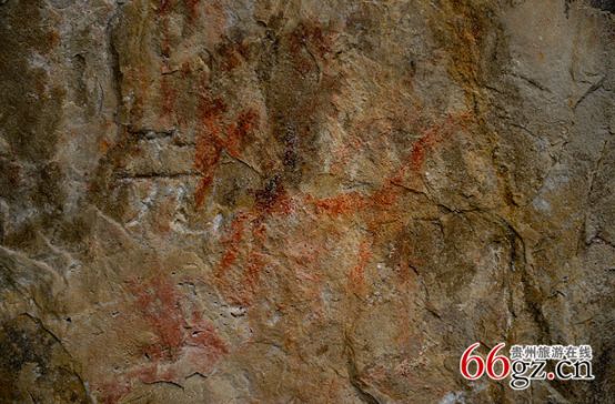 據(jù)資料載,金山洞古代崖畫以赭色涂繪人、馬、狗等等,隱約可見形態(tài)各異的大小圖像二三十個。人物多作行走狀,亦有雙手高舉者,似乎在祈禱。從其畫風(fēng)觀察,與相距不遠(yuǎn)的省級文物保護(hù)單位--長順龍家院崖畫十分相似。
