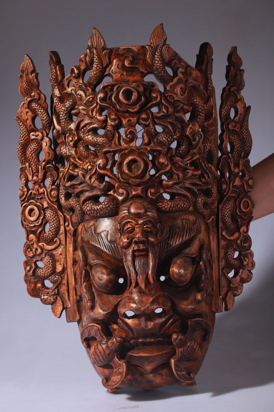 描述:程咬金,字義貞,原名咬金,后更名知節(jié)。驍勇善戰(zhàn),歷史上是唐朝開(kāi)國(guó)名將,以“三板斧”的形象在民間廣為流傳。在地戲唱本《薛仁貴征東》和《薛丁山征西》中,均有程咬金的出場(chǎng)。根據(jù)《隋唐演義》的內(nèi)容,程咬金雖然頭腦簡(jiǎn)單,卻是個(gè)有福之人,被認(rèn)為是福將,所以在地戲面具的刻畫(huà)上,在嘴角兩側(cè)雕刻上一堆蝙蝠,以取“?!钡闹C音。又因?yàn)槌桃Ы鹪谔拼闶情L(zhǎng)壽之人,故爾額頭上刻一壽星,帶給人福壽雙全的吉祥含義。