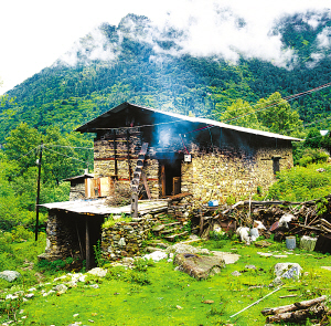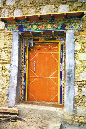 房屋大都是3層,上層存放干草和秸桿,下層關(guān)養(yǎng)牲畜,中間一層是居室。居室用木板隔間,里間較小是已婚子女住的,外間寬敞,是多功能堂屋。臨窗處設(shè)火塘,以利排煙,是家庭生活中心和待客之處。火塘上架著碩大的鐵三角架,上面是六七厘米寬的鐵板圈,擦得錚亮,能烤制食物。墻角處供奉佛像,擺放領(lǐng)袖像。房門安設(shè)木鎖,用十幾厘米的木鑰匙開啟,都是由硬木刻制,光滑耐用。