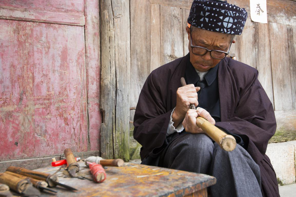 批林村除了傳統(tǒng)民居之外,自然還有屬于他們的傳統(tǒng)服飾。批林村的男子傳統(tǒng)服飾較為簡單,主要以青藍(lán)色斜襟長衫為主,頭飾用六米長的布條圍成的帽子。在批林村鬼師的穿戴中,與眾不同的是,鬼師還會外披一件亮黃色大衣,胸前帶有銀圈。