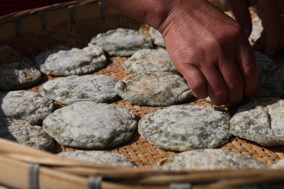 除了少部分近期使用,需要及時加工,大部分清明菜將進入儲存的工序。張國秀將煮熟的清明菜置于陽光下暴曬,水分的減少抑制了酶的活性,完全曬干后能保存半年之久。為了保證一年的供應,另一部分需要放入冰柜中冷藏。